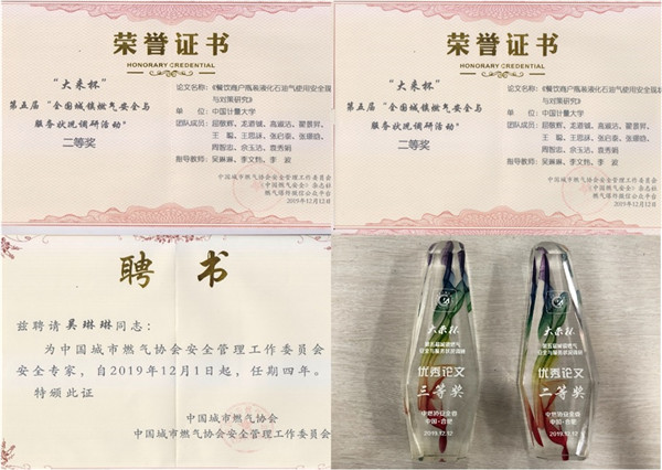 同时,质安学院王聪与湖北一线的燃气具安装工作人员李增华合作组队(指导老师吴琳琳),针对一线燃气器具安装现状,完成“家用燃气器具安装质量对用气安全影响调研分析”,并获得调研大赛三等奖。质安学院吴琳琳老师获聘为中燃协安全委专家。